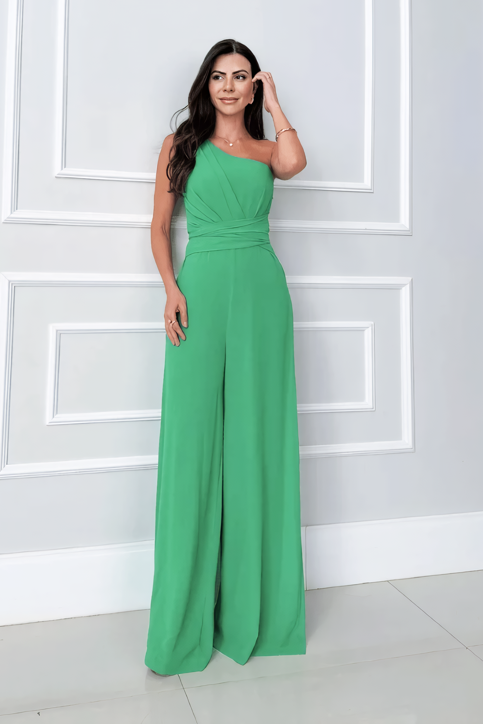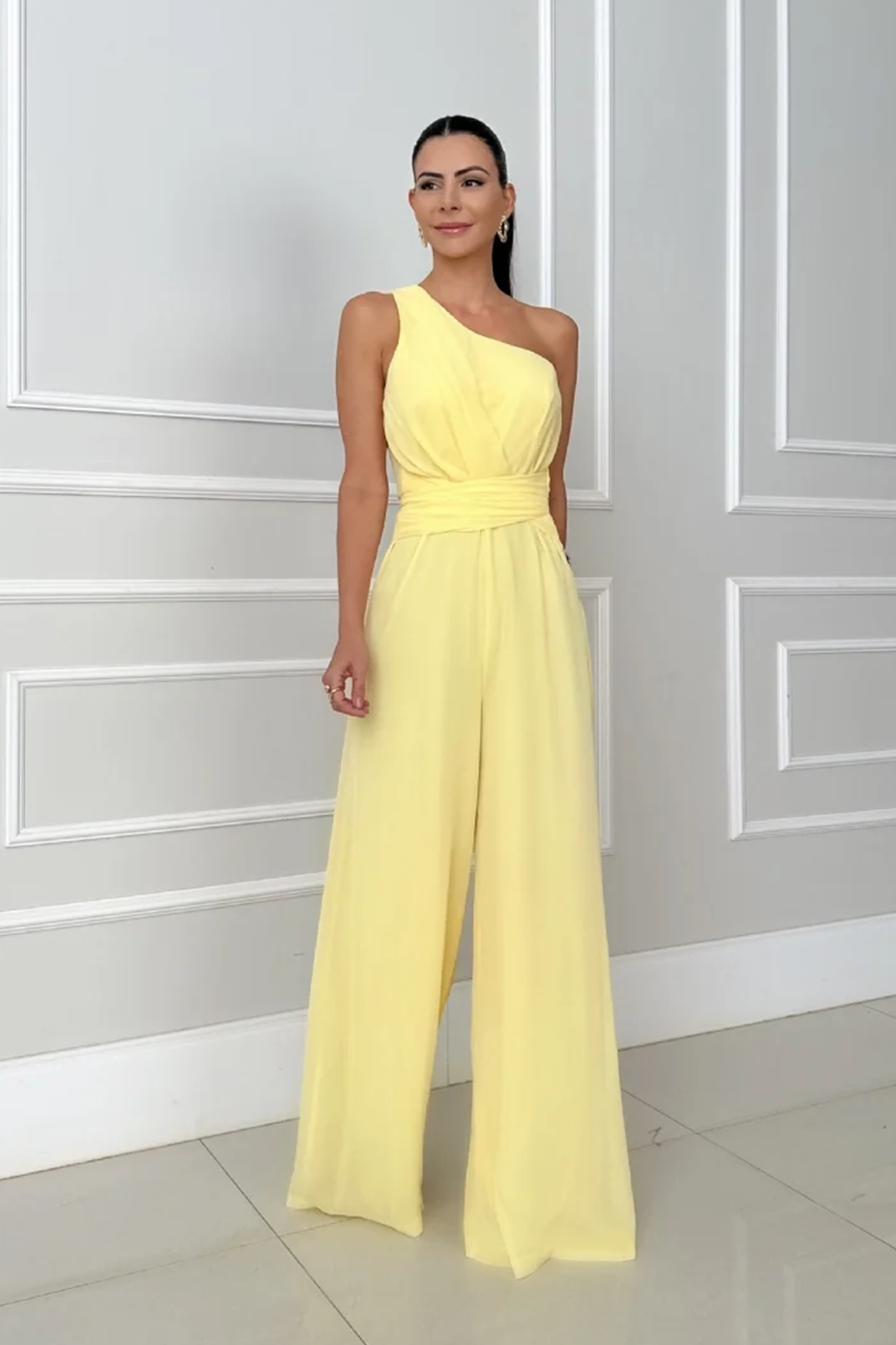 Enterizo de un solo hombro confeccionado en una tela ligera y fluida que aporta movimiento y elegancia. Presenta un delicado drapeado cruzado en el busto y una faja ancha que realza la cintura, mientras el pantalón de corte palazzo alarga la silueta y aporta una caída sofisticada. Una prenda ideal para eventos de día, bodas civiles o cocteles, que combina frescura, estilo y feminidad en cada detalle.
