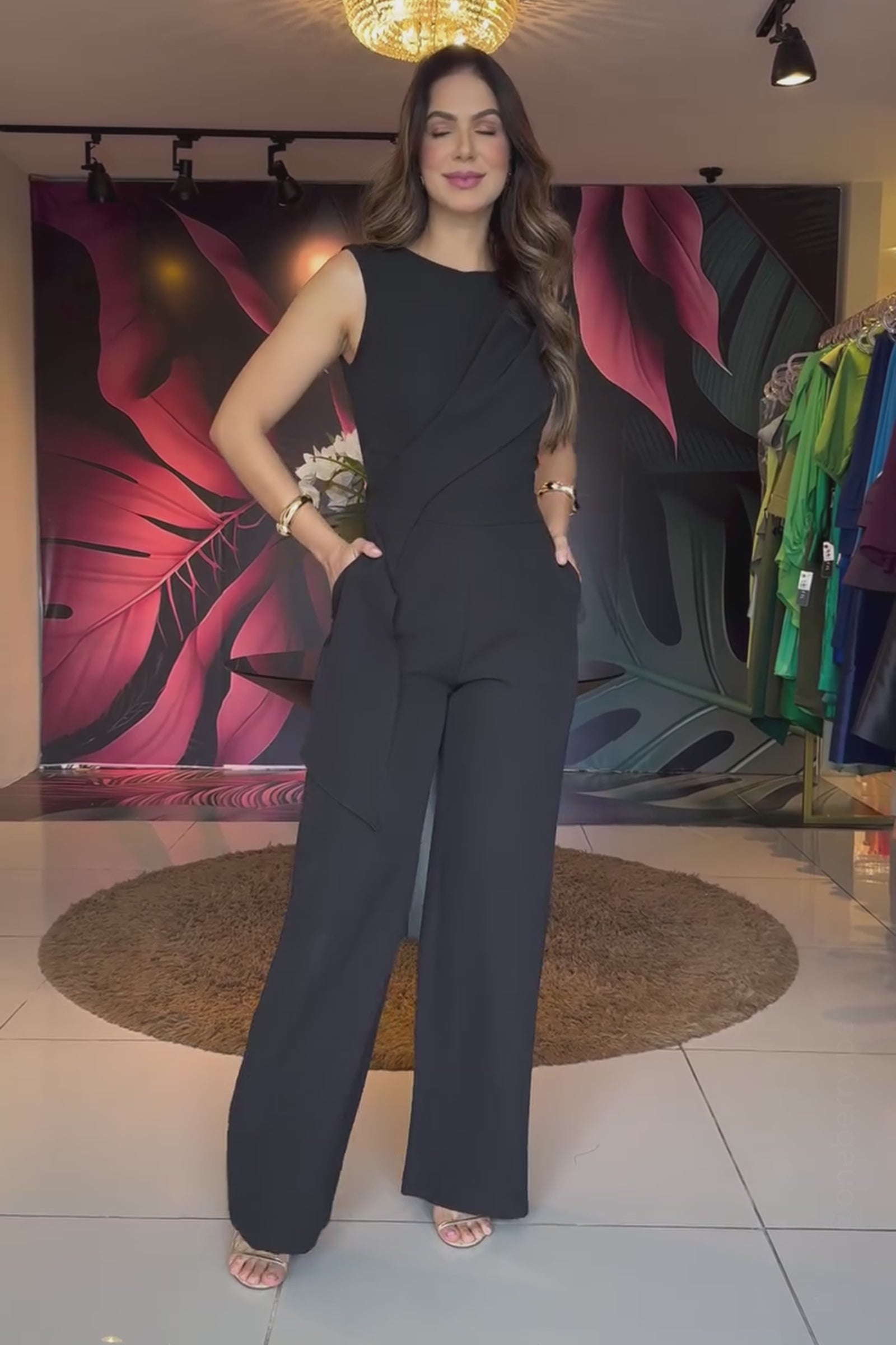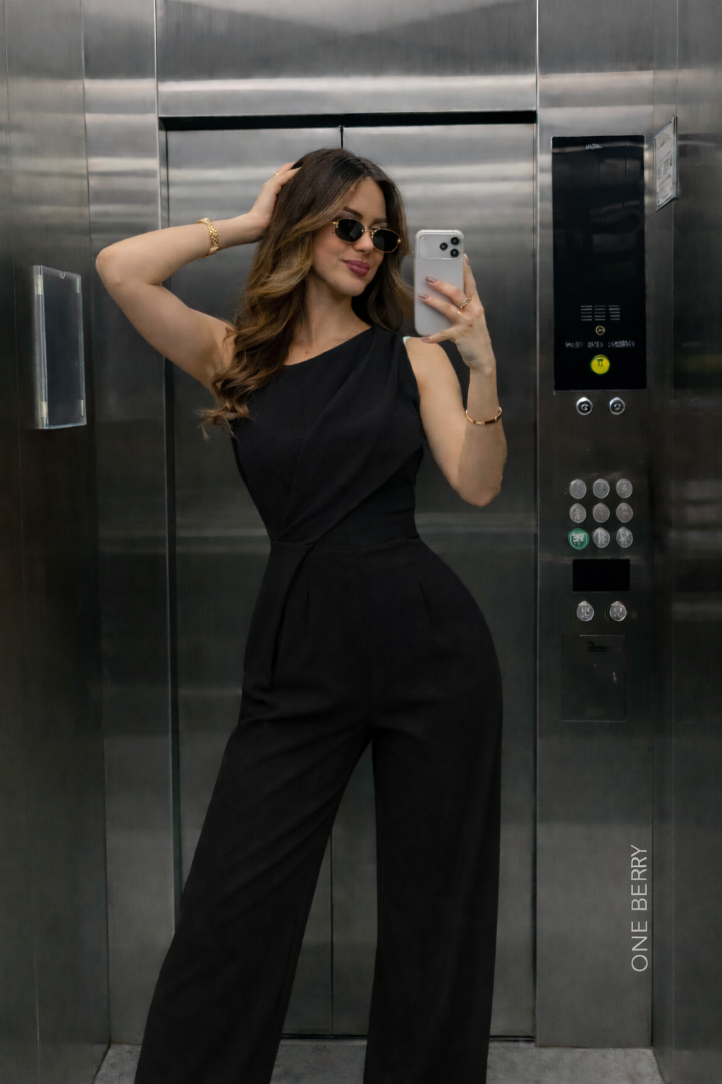 El enterizo Laura de diseño asimétrico en donde el hombro derecho un pliegue diagonal que cruza el pecho mientras que el hombro izquierdo está descubierto, lleva un corte entallado en la cintura para realzar tu figura con elegancia, en la parte inferior lleva un corte palazzo para aportar movimiento y comodidad. Cierre invisible y pinzas posteriores.