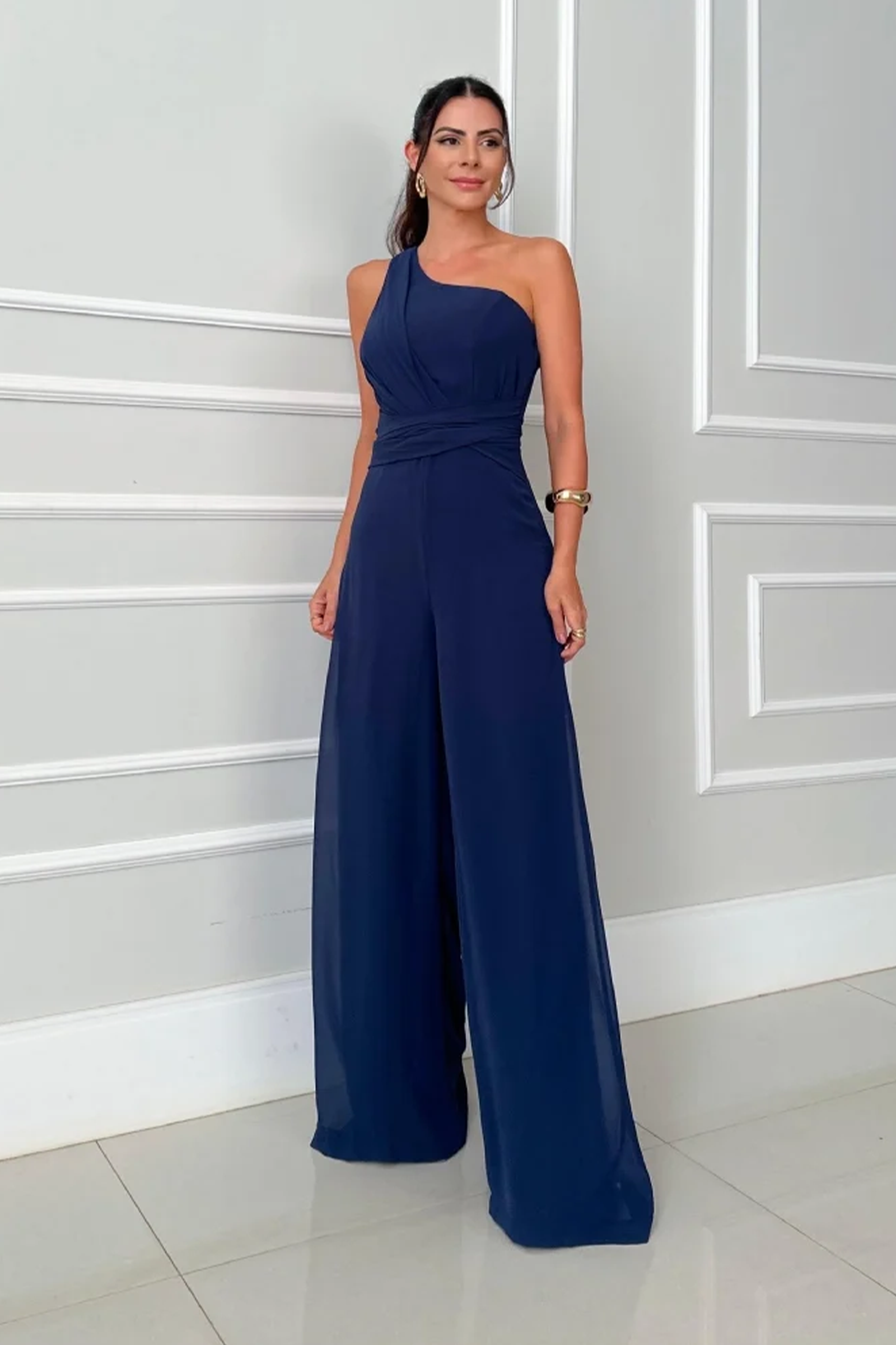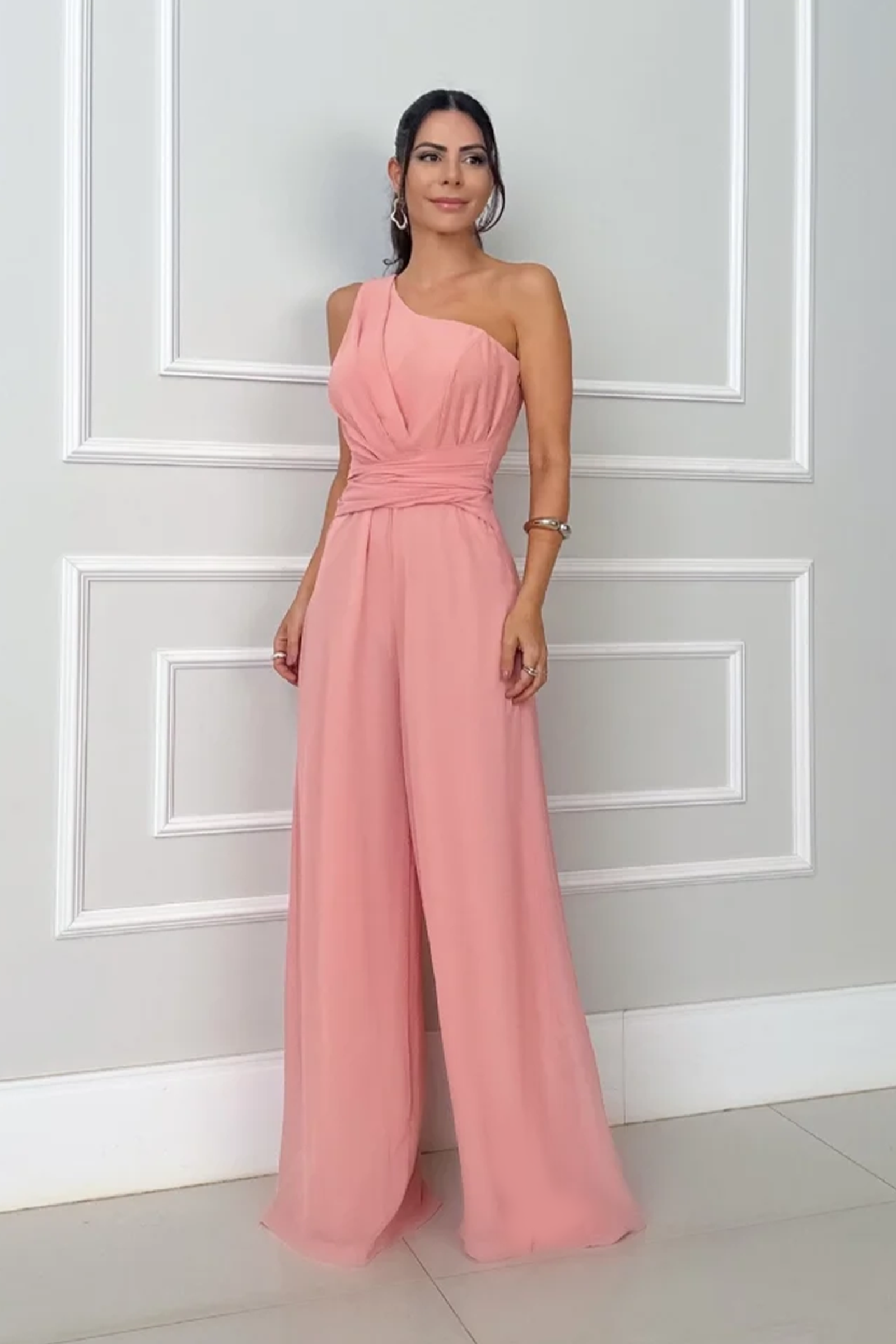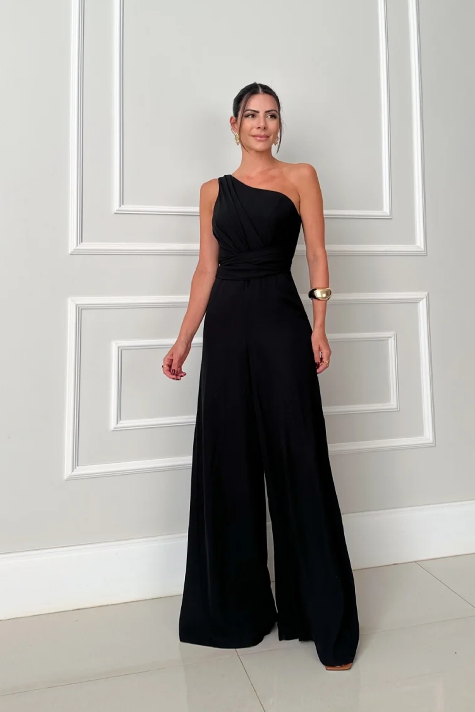 Enterizo largo, con escote asimétrico de un solo hombro que aporta un toque moderno, parte superior con drapeado cruzado que estiliza el torso y define la cintura, pantalón palazzo de caída amplia que alarga visualmente la silueta y brinda movimiento, confeccionado en una tela fluida ideal para eventos formales, cenas o celebraciones nocturnas.