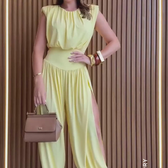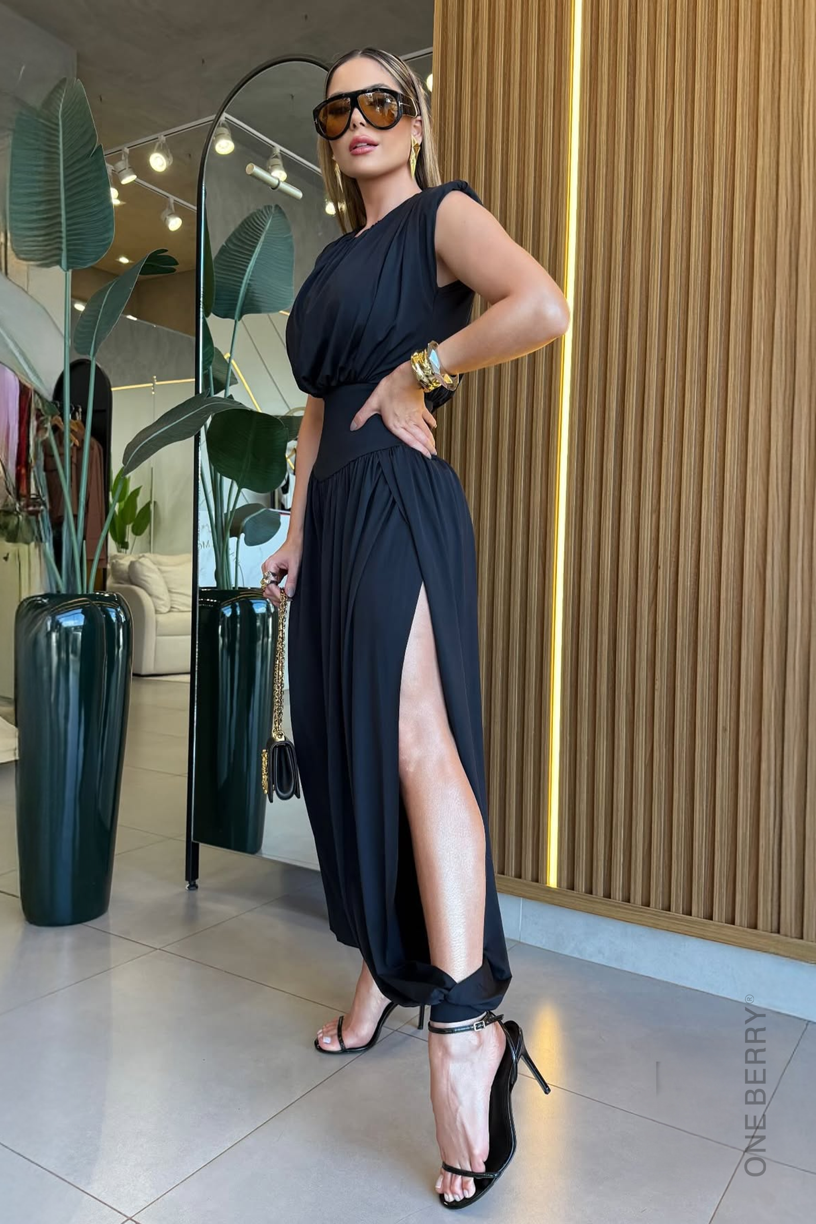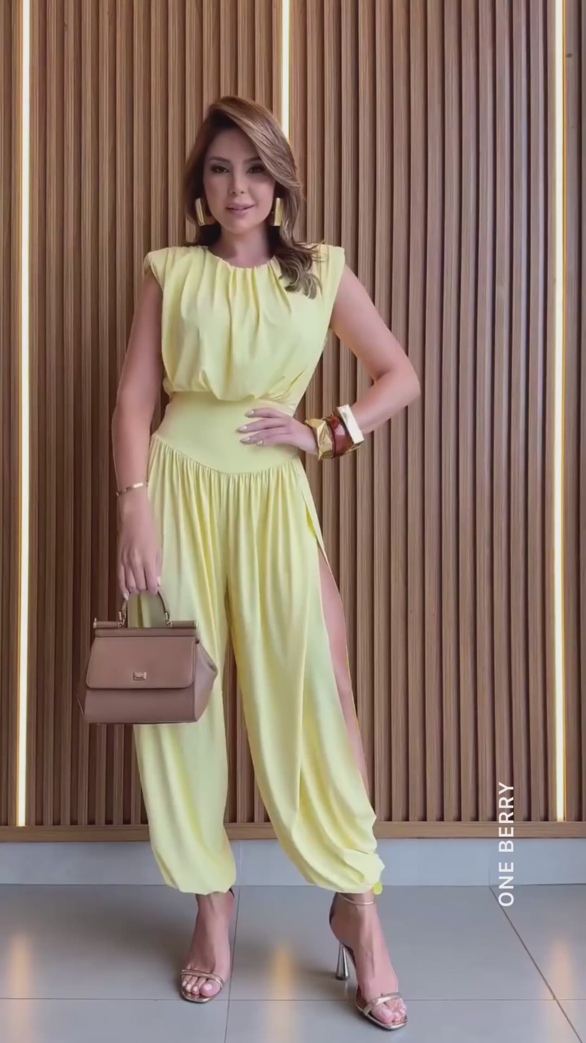 Enterizo largo de caída suave y elegante. Lleva cuello fruncido con efecto drapeado en el pecho y hombros estructurados que realzan la silueta. La cintura entallada define el cuerpo y la parte inferior tipo pantalón amplio con movimiento, con aberturas laterales que aportan un toque moderno y súper femenino.