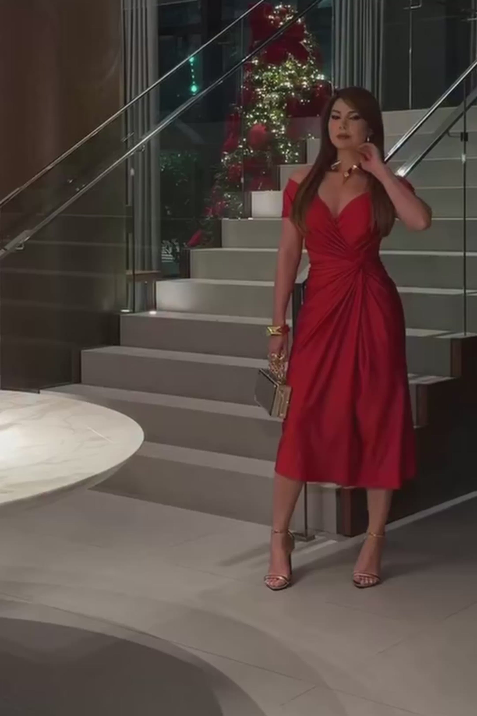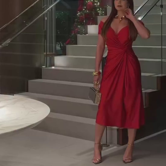 Vestido de silueta entallada, diseñado para realzar la figura con elegancia y sofisticación. Presenta un escote en V cruzado que define el busto de forma delicada y femenina, acompañado de mangas cortas tipo off-shoulder que dejan los hombros sutilmente descubiertos.