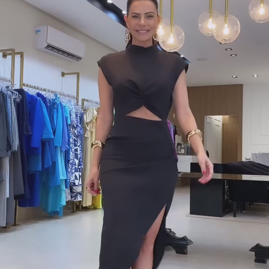 El vestido Nicole, de estilo midi y de corte entallado, realza tu silueta femenina con elegancia. Presenta cuello alto y de manga cero, ideal para un look moderno y sofisticado. En el abdomen, un corte abierto en forma triangular para un toque original, mientras que la abertura lateral en la pierna izquierda aporta movimiento y sensualidad. En la parte posterior-superior, incluye dos botones funcionales y una semi abertura que hacen de esta prenda que sea una pieza única. Además, cuenta con cierre invisible y pinzas posteriores que moldean y estilizan tu figura.